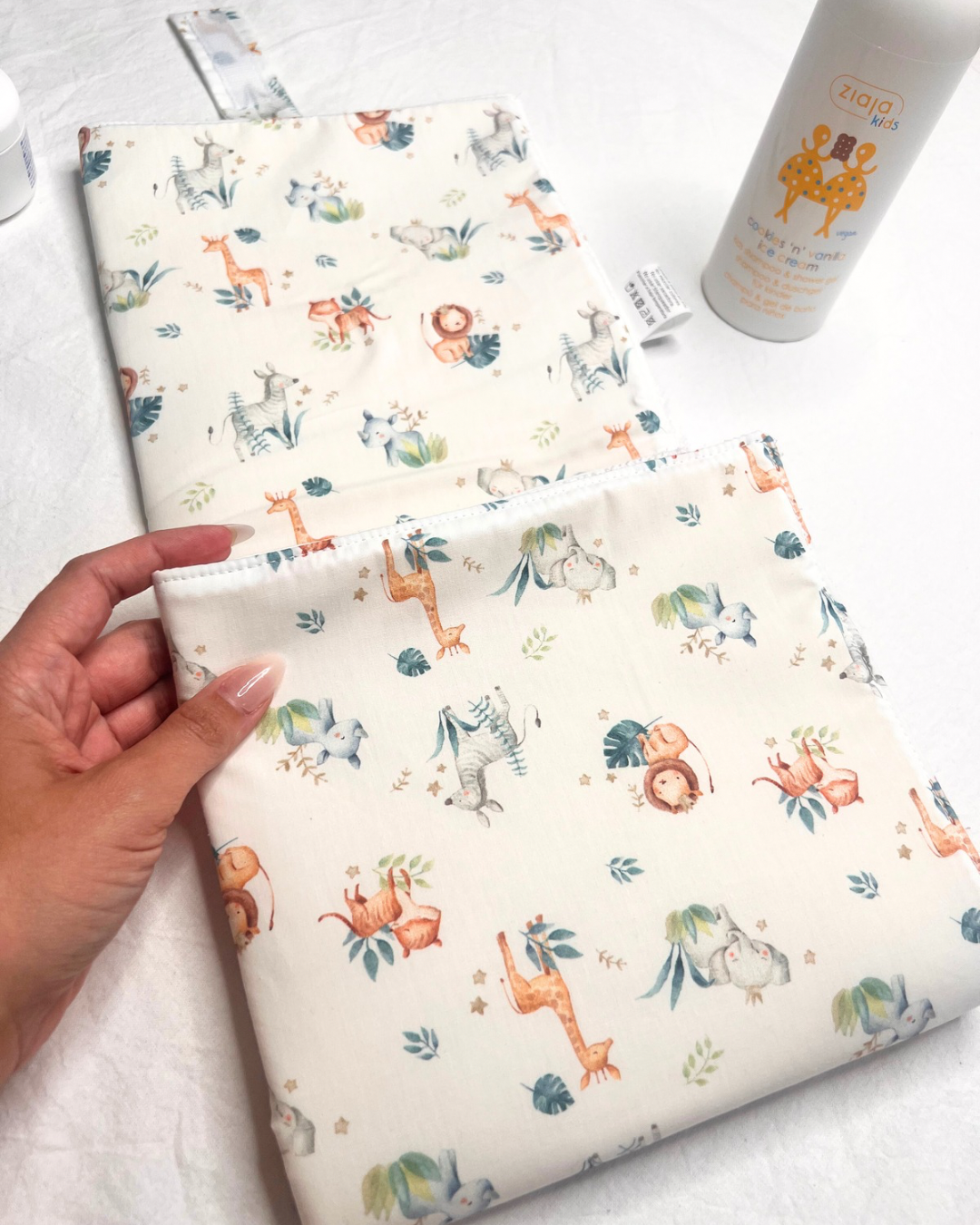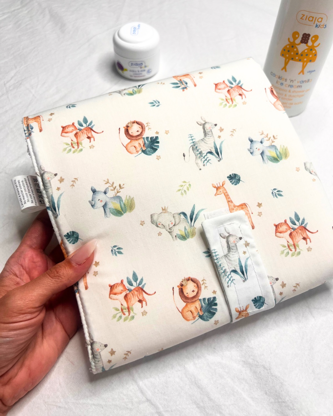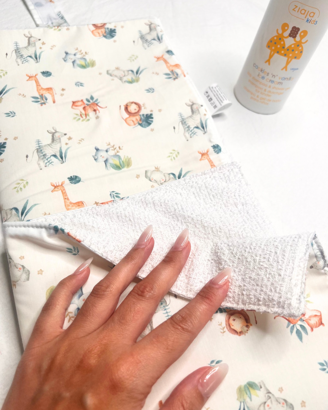 Fabricado con tejido de algodón estampado con animalitos de la selva y toalla rizo 100% algodón en el interior, es suave, absorbente y cómodo para el bebé. Su diseño plegable con cierre de velcro lo hace perfecto para cambiar al peque en cualquier lugar.