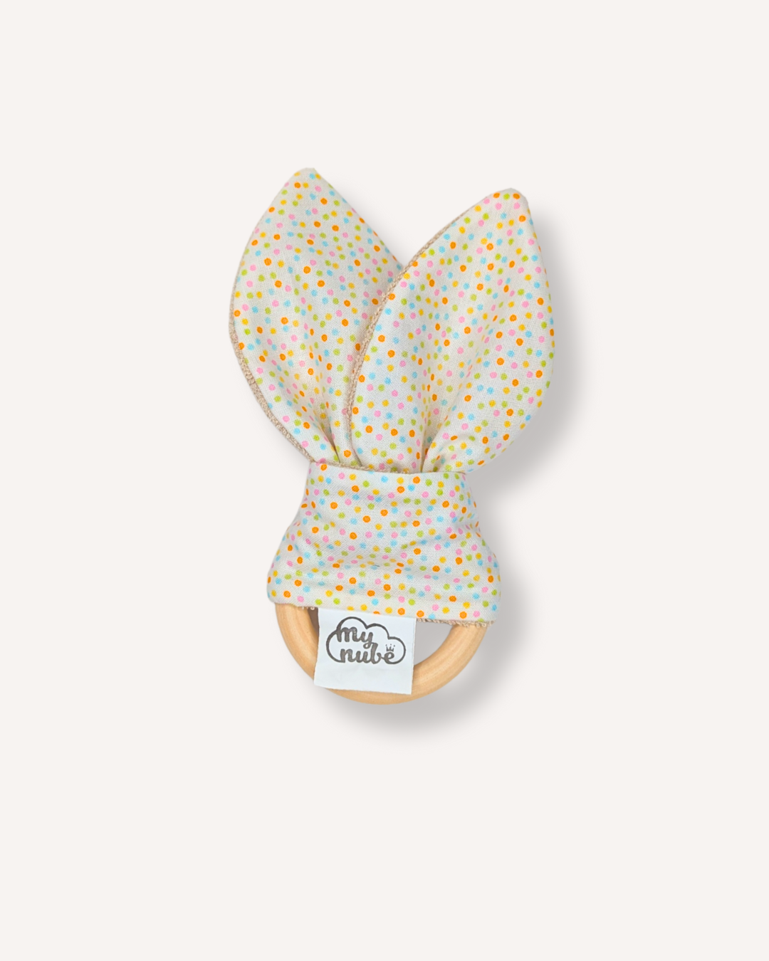 ✅ Mordedor de madera natural con orejitas de tela: Diseñado para aliviar las encías del bebé con materiales seguros y sostenibles.