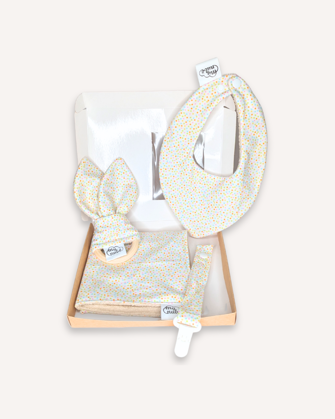 Todos los artículos están confeccionados con materiales ecológicos como rizo de toalla de bambú y algodón orgánico, seleccionados por su suavidad, durabilidad y respeto por la piel sensible del bebé. Además, el mordedor incluye madera natural tratada, libre de productos químicos.
