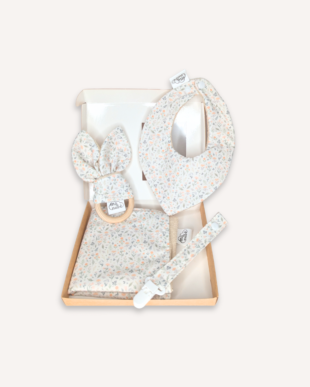 Todos los artículos están confeccionados con materiales ecológicos como rizo de toalla de bambú y algodón orgánico, seleccionados por su suavidad, durabilidad y respeto por la piel sensible del bebé. Además, el mordedor incluye madera natural tratada, libre de productos químicos.