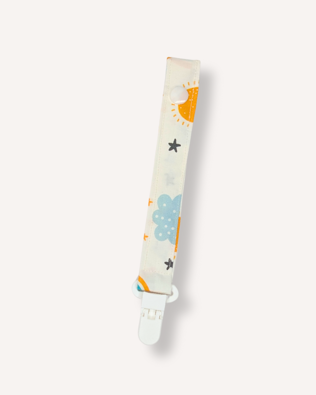 Está confeccionado en algodón suave, ideal para la piel delicada del bebé, e incorpora una pinza de plástico resistente, ligera y segura, que se sujeta fácilmente sin dañar las prendas. Su cierre snap de presión permite colocar y retirar el chupete de forma rápida y sencilla.