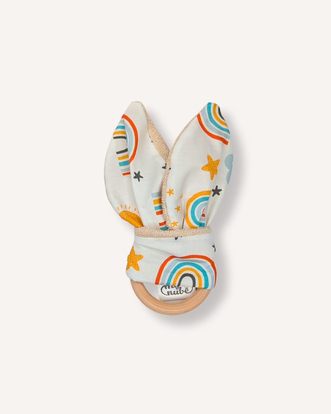 Mordedor de madera natural con orejitas de tela My Nube Azul