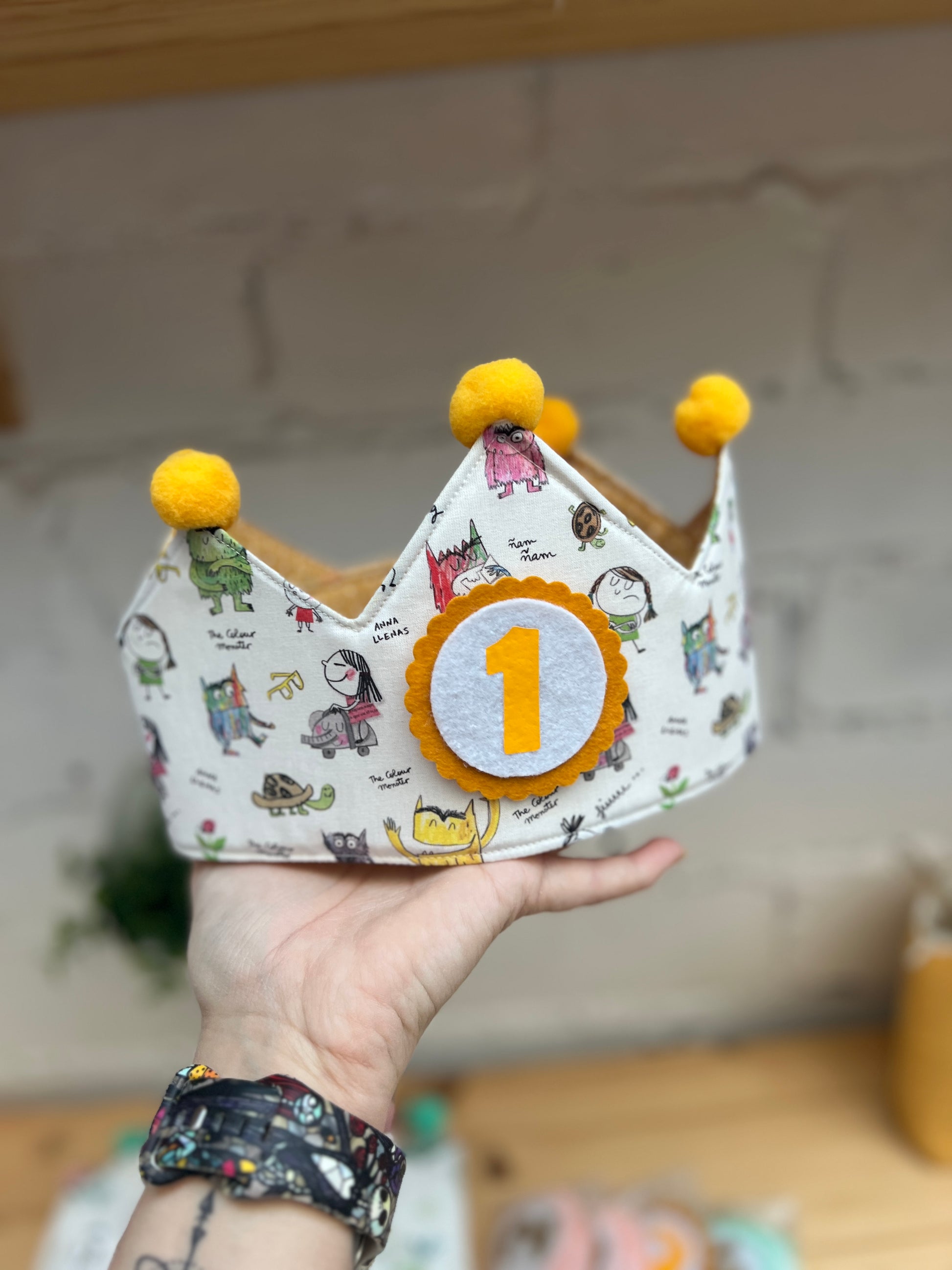 - Decorada con divertidas calaveras y pompones amarillos, esta corona incluye números intercambiables del 1 al 5, adaptándose a cada cumpleaños hasta los 5 años.