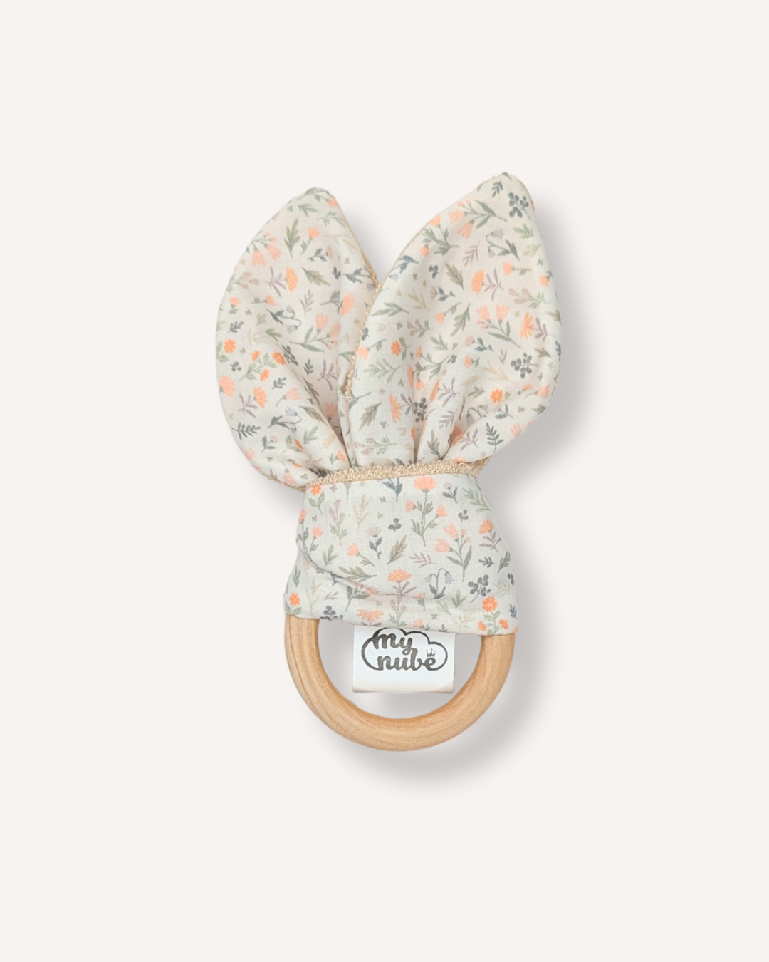 Mordedor de madera natural con orejitas de tela My Nube Azul