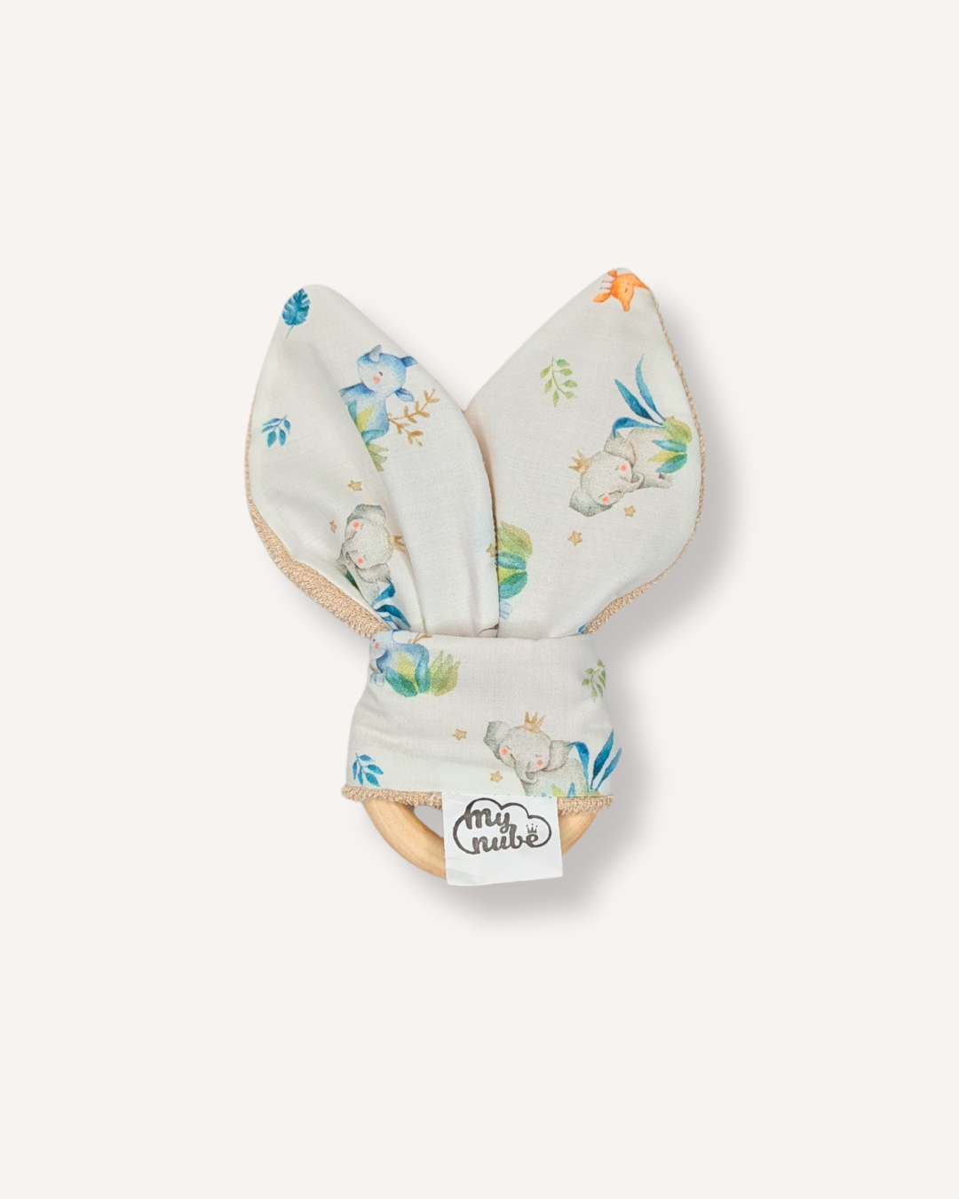 Mordedor de madera natural con orejitas de tela My Nube Azul